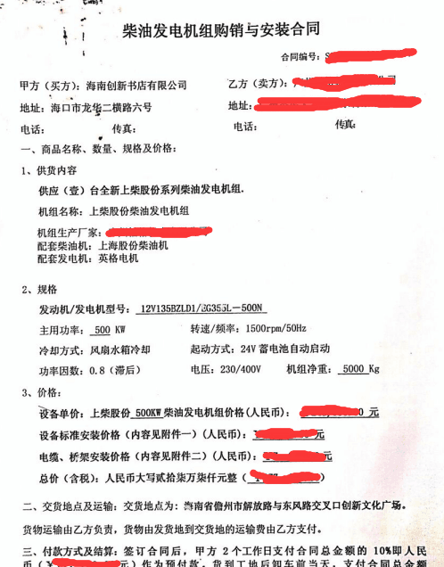我司与海南创新书店签订发电机组购销合同