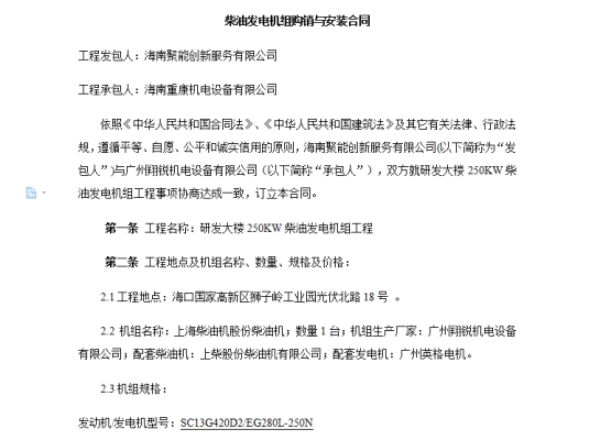 我公司为海南聚能创新供应250KW上柴股份柴油机